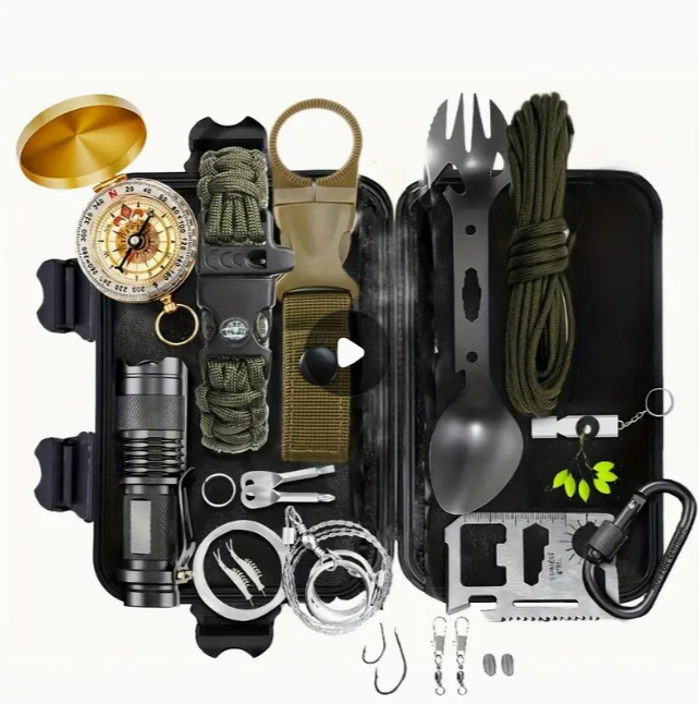 Volledige 12-in-1 Overlevingskit met Kompas & Ansteker - Ideaal voor Kamperen, Picknicks, Jagen & Vissen -
